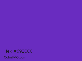 Hex #692cc0 Color is a normal violet color and the nearest color is Purple Heart Crayola #652dc1. Hex code #692cc0 and RGB value is rgb(105,44,192). In RGB color space, this color is composed of 41% red, 17% green, 75% blue, In CMYK color space, this color is composed of 45% cyan, 77% magenta, 0% yellow , 25% black , In HSL color space, this color has a hue angle of 265° , 63% saturation and 46% lightness.