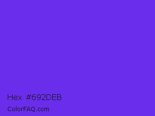 Hex #692deb Color is a normal indigo color and the nearest color is Blue Violet #8a2be2. Hex code #692deb and RGB value is rgb(105,45,235). In RGB color space, this color is composed of 41% red, 18% green, 92% blue, In CMYK color space, this color is composed of 55% cyan, 81% magenta, 0% yellow , 8% black , In HSL color space, this color has a hue angle of 259° , 83% saturation and 55% lightness.