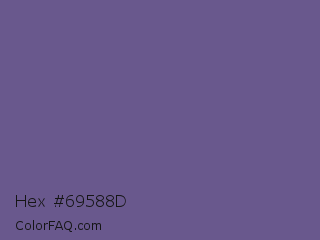 Hex #69588d Color is a normal indigo color and the nearest color is Dark Lavender #734f96. Hex code #69588d and RGB value is rgb(105,88,141). In RGB color space, this color is composed of 41% red, 35% green, 55% blue, In CMYK color space, this color is composed of 26% cyan, 38% magenta, 0% yellow , 45% black , In HSL color space, this color has a hue angle of 259° , 23% saturation and 45% lightness.