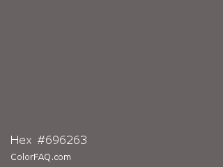 Hex #696263 Color is a normal red color and the nearest color is Scorpion #695f62. Hex code #696263 and RGB value is rgb(105,98,99). In RGB color space, this color is composed of 41% red, 38% green, 39% blue, In CMYK color space, this color is composed of 0% cyan, 7% magenta, 6% yellow , 59% black , In HSL color space, this color has a hue angle of 351° , 3% saturation and 40% lightness.