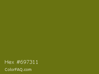 Hex #697311 Color is a dark yellow color and the nearest color is Olivetone #716e10. Hex code #697311 and RGB value is rgb(105,115,17). In RGB color space, this color is composed of 41% red, 45% green, 7% blue, In CMYK color space, this color is composed of 9% cyan, 0% magenta, 85% yellow , 55% black , In HSL color space, this color has a hue angle of 66° , 74% saturation and 26% lightness.