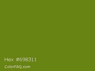 Hex #698311 Color is a dark lime color and the nearest color is Pacifika #778120. Hex code #698311 and RGB value is rgb(105,131,17). In RGB color space, this color is composed of 41% red, 51% green, 7% blue, In CMYK color space, this color is composed of 20% cyan, 0% magenta, 87% yellow , 49% black , In HSL color space, this color has a hue angle of 74° , 77% saturation and 29% lightness.