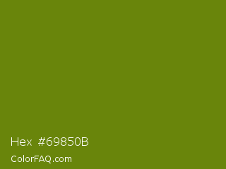 Hex #69850b Color is a dark lime color and the nearest color is Avocado #568203. Hex code #69850b and RGB value is rgb(105,133,11). In RGB color space, this color is composed of 41% red, 52% green, 4% blue, In CMYK color space, this color is composed of 21% cyan, 0% magenta, 92% yellow , 48% black , In HSL color space, this color has a hue angle of 74° , 85% saturation and 28% lightness.