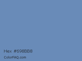 Hex #698bb8 Color is a normal blue color and the nearest color is Silver Lake Blue #5d89ba. Hex code #698bb8 and RGB value is rgb(105,139,184). In RGB color space, this color is composed of 41% red, 55% green, 72% blue, In CMYK color space, this color is composed of 43% cyan, 24% magenta, 0% yellow , 28% black , In HSL color space, this color has a hue angle of 214° , 36% saturation and 57% lightness.