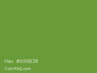 Hex #699b38 Color is a normal green color and the nearest color is Palm Leaf #6f9940. Hex code #699b38 and RGB value is rgb(105,155,56). In RGB color space, this color is composed of 41% red, 61% green, 22% blue, In CMYK color space, this color is composed of 32% cyan, 0% magenta, 64% yellow , 39% black , In HSL color space, this color has a hue angle of 90° , 47% saturation and 41% lightness.