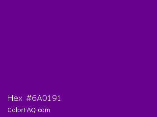 Hex #6a0191 Color is a dark purple color and the nearest color is Purple #660099. Hex code #6a0191 and RGB value is rgb(106,1,145). In RGB color space, this color is composed of 42% red, 0% green, 57% blue, In CMYK color space, this color is composed of 27% cyan, 99% magenta, 0% yellow , 43% black , In HSL color space, this color has a hue angle of 284° , 99% saturation and 29% lightness.