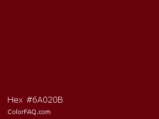 Hex #6a020b Color is a very dark red color and the nearest color is Rosewood #65000b. Hex code #6a020b and RGB value is rgb(106,2,11). In RGB color space, this color is composed of 42% red, 1% green, 4% blue, In CMYK color space, this color is composed of 0% cyan, 98% magenta, 90% yellow , 58% black , In HSL color space, this color has a hue angle of 355° , 96% saturation and 21% lightness.