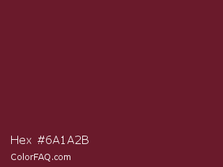 Hex #6a1a2b Color is a dark red color and the nearest color is Persian Plum #701c1c. Hex code #6a1a2b and RGB value is rgb(106,26,43). In RGB color space, this color is composed of 42% red, 10% green, 17% blue, In CMYK color space, this color is composed of 0% cyan, 75% magenta, 59% yellow , 58% black , In HSL color space, this color has a hue angle of 347° , 61% saturation and 26% lightness.