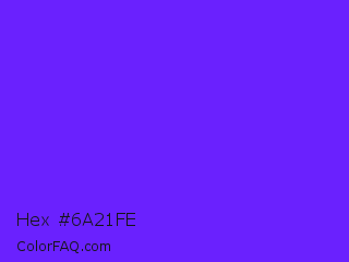 Hex #6a21fe Color is a normal indigo color and the nearest color is Han Purple #5218fa. Hex code #6a21fe and RGB value is rgb(106,33,254). In RGB color space, this color is composed of 42% red, 13% green, 100% blue, In CMYK color space, this color is composed of 58% cyan, 87% magenta, 0% yellow , 0% black , In HSL color space, this color has a hue angle of 260° , 99% saturation and 56% lightness.