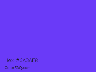 Hex #6a3af8 Color is a normal indigo color and the nearest color is Majorelle Blue #6050dc. Hex code #6a3af8 and RGB value is rgb(106,58,248). In RGB color space, this color is composed of 42% red, 23% green, 97% blue, In CMYK color space, this color is composed of 57% cyan, 77% magenta, 0% yellow , 3% black , In HSL color space, this color has a hue angle of 255° , 93% saturation and 60% lightness.