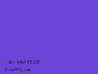 Hex #6a45d8 Color is a normal indigo color and the nearest color is Majorelle Blue #6050dc. Hex code #6a45d8 and RGB value is rgb(106,69,216). In RGB color space, this color is composed of 42% red, 27% green, 85% blue, In CMYK color space, this color is composed of 51% cyan, 68% magenta, 0% yellow , 15% black , In HSL color space, this color has a hue angle of 255° , 65% saturation and 56% lightness.