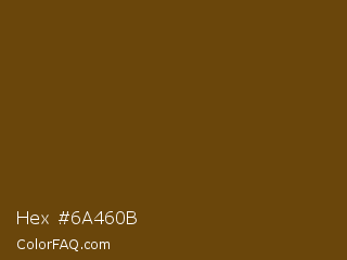 Hex #6a460b Color is a dark orange color and the nearest color is Cafe Royale #6f440c. Hex code #6a460b and RGB value is rgb(106,70,11). In RGB color space, this color is composed of 42% red, 27% green, 4% blue, In CMYK color space, this color is composed of 0% cyan, 34% magenta, 90% yellow , 58% black , In HSL color space, this color has a hue angle of 37° , 81% saturation and 23% lightness.