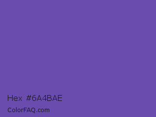 Hex #6a4bae Color is a normal indigo color and the nearest color is Studio #714ab2. Hex code #6a4bae and RGB value is rgb(106,75,174). In RGB color space, this color is composed of 42% red, 29% green, 68% blue, In CMYK color space, this color is composed of 39% cyan, 57% magenta, 0% yellow , 32% black , In HSL color space, this color has a hue angle of 259° , 40% saturation and 49% lightness.