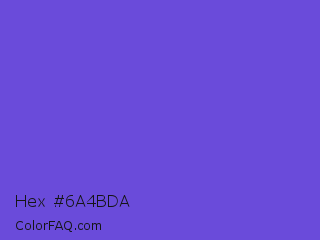 Hex #6a4bda Color is a normal indigo color and the nearest color is Majorelle Blue #6050dc. Hex code #6a4bda and RGB value is rgb(106,75,218). In RGB color space, this color is composed of 42% red, 29% green, 85% blue, In CMYK color space, this color is composed of 51% cyan, 66% magenta, 0% yellow , 15% black , In HSL color space, this color has a hue angle of 253° , 66% saturation and 57% lightness.