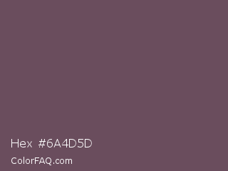 Hex #6a4d5d Color is a normal magenta color and the nearest color is Zambezi #685558. Hex code #6a4d5d and RGB value is rgb(106,77,93). In RGB color space, this color is composed of 42% red, 30% green, 36% blue, In CMYK color space, this color is composed of 0% cyan, 27% magenta, 12% yellow , 58% black , In HSL color space, this color has a hue angle of 327° , 16% saturation and 36% lightness.