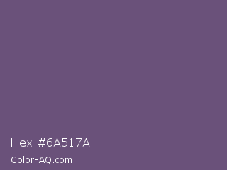 Hex #6a517a Color is a normal purple color and the nearest color is Smoky #605b73. Hex code #6a517a and RGB value is rgb(106,81,122). In RGB color space, this color is composed of 42% red, 32% green, 48% blue, In CMYK color space, this color is composed of 13% cyan, 34% magenta, 0% yellow , 52% black , In HSL color space, this color has a hue angle of 277° , 20% saturation and 40% lightness.