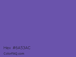 Hex #6a53ac Color is a normal indigo color and the nearest color is Blue Violet #6456b7. Hex code #6a53ac and RGB value is rgb(106,83,172). In RGB color space, this color is composed of 42% red, 33% green, 67% blue, In CMYK color space, this color is composed of 38% cyan, 52% magenta, 0% yellow , 33% black , In HSL color space, this color has a hue angle of 256° , 35% saturation and 50% lightness.