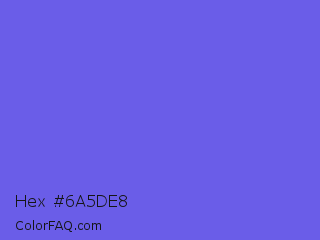 Hex #6a5de8 Color is a light indigo color and the nearest color is Majorelle Blue #6050dc. Hex code #6a5de8 and RGB value is rgb(106,93,232). In RGB color space, this color is composed of 42% red, 36% green, 91% blue, In CMYK color space, this color is composed of 54% cyan, 60% magenta, 0% yellow , 9% black , In HSL color space, this color has a hue angle of 246° , 75% saturation and 64% lightness.