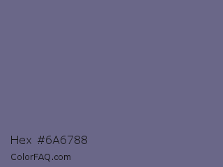 Hex #6a6788 Color is a normal indigo color and the nearest color is Storm Gray #717486. Hex code #6a6788 and RGB value is rgb(106,103,136). In RGB color space, this color is composed of 42% red, 40% green, 53% blue, In CMYK color space, this color is composed of 22% cyan, 24% magenta, 0% yellow , 47% black , In HSL color space, this color has a hue angle of 245° , 14% saturation and 47% lightness.