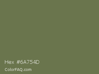 Hex #6a754d Color is a normal lime color and the nearest color is Go Ben #726d4e. Hex code #6a754d and RGB value is rgb(106,117,77). In RGB color space, this color is composed of 42% red, 46% green, 30% blue, In CMYK color space, this color is composed of 9% cyan, 0% magenta, 34% yellow , 54% black , In HSL color space, this color has a hue angle of 77° , 21% saturation and 38% lightness.