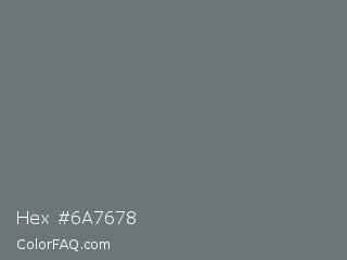 Hex #6a7678 Color is a normal cyan color and the nearest color is Nickel #727472. Hex code #6a7678 and RGB value is rgb(106,118,120). In RGB color space, this color is composed of 42% red, 46% green, 47% blue, In CMYK color space, this color is composed of 12% cyan, 2% magenta, 0% yellow , 53% black , In HSL color space, this color has a hue angle of 189° , 6% saturation and 44% lightness.