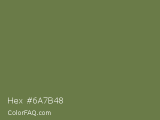 Hex #6a7b48 Color is a normal green color and the nearest color is Dingley #5d7747. Hex code #6a7b48 and RGB value is rgb(106,123,72). In RGB color space, this color is composed of 42% red, 48% green, 28% blue, In CMYK color space, this color is composed of 14% cyan, 0% magenta, 41% yellow , 52% black , In HSL color space, this color has a hue angle of 80° , 26% saturation and 38% lightness.