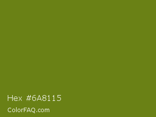 Hex #6a8115 Color is a dark lime color and the nearest color is Pacifika #778120. Hex code #6a8115 and RGB value is rgb(106,129,21). In RGB color space, this color is composed of 42% red, 51% green, 8% blue, In CMYK color space, this color is composed of 18% cyan, 0% magenta, 84% yellow , 49% black , In HSL color space, this color has a hue angle of 73° , 72% saturation and 29% lightness.