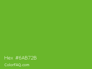 Hex #6ab72b Color is a normal green color and the nearest color is Green RYB #66b032. Hex code #6ab72b and RGB value is rgb(106,183,43). In RGB color space, this color is composed of 42% red, 72% green, 17% blue, In CMYK color space, this color is composed of 42% cyan, 0% magenta, 77% yellow , 28% black , In HSL color space, this color has a hue angle of 93° , 62% saturation and 44% lightness.