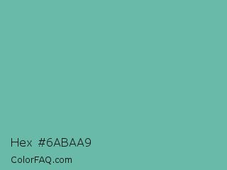 Hex #6abaa9 Color is a normal cyan color and the nearest color is Tradewind #5fb3ac. Hex code #6abaa9 and RGB value is rgb(106,186,169). In RGB color space, this color is composed of 42% red, 73% green, 66% blue, In CMYK color space, this color is composed of 43% cyan, 0% magenta, 9% yellow , 27% black , In HSL color space, this color has a hue angle of 167° , 37% saturation and 57% lightness.