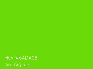 Hex #6ada08 Color is a normal green color and the nearest color is Alien Armpit #84de02. Hex code #6ada08 and RGB value is rgb(106,218,8). In RGB color space, this color is composed of 42% red, 85% green, 3% blue, In CMYK color space, this color is composed of 51% cyan, 0% magenta, 96% yellow , 15% black , In HSL color space, this color has a hue angle of 92° , 93% saturation and 44% lightness.