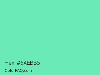 Hex #6aebb5 Color is a light green color and the nearest color is Medium Aquamarine #66ddaa. Hex code #6aebb5 and RGB value is rgb(106,235,181). In RGB color space, this color is composed of 42% red, 92% green, 71% blue, In CMYK color space, this color is composed of 55% cyan, 0% magenta, 23% yellow , 8% black , In HSL color space, this color has a hue angle of 155° , 76% saturation and 67% lightness.