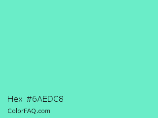 Hex #6aedc8 Color is a light green color and the nearest color is Bermuda #7dd8c6. Hex code #6aedc8 and RGB value is rgb(106,237,200). In RGB color space, this color is composed of 42% red, 93% green, 78% blue, In CMYK color space, this color is composed of 55% cyan, 0% magenta, 16% yellow , 7% black , In HSL color space, this color has a hue angle of 163° , 78% saturation and 67% lightness.