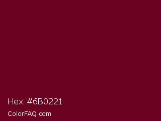 Hex #6b0221 Color is a very dark rose color and the nearest color is Black Rose #67032d. Hex code #6b0221 and RGB value is rgb(107,2,33). In RGB color space, this color is composed of 42% red, 1% green, 13% blue, In CMYK color space, this color is composed of 0% cyan, 98% magenta, 69% yellow , 58% black , In HSL color space, this color has a hue angle of 342° , 96% saturation and 21% lightness.