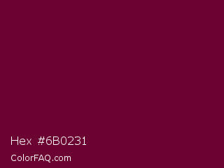 Hex #6b0231 Color is a very dark rose color and the nearest color is Black Rose #67032d. Hex code #6b0231 and RGB value is rgb(107,2,49). In RGB color space, this color is composed of 42% red, 1% green, 19% blue, In CMYK color space, this color is composed of 0% cyan, 98% magenta, 54% yellow , 58% black , In HSL color space, this color has a hue angle of 333° , 96% saturation and 21% lightness.