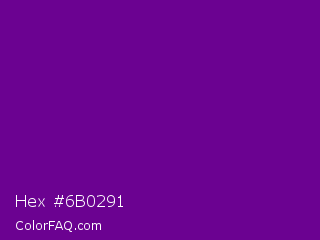 Hex #6b0291 Color is a dark purple color and the nearest color is Purple #660099. Hex code #6b0291 and RGB value is rgb(107,2,145). In RGB color space, this color is composed of 42% red, 1% green, 57% blue, In CMYK color space, this color is composed of 26% cyan, 99% magenta, 0% yellow , 43% black , In HSL color space, this color has a hue angle of 284° , 97% saturation and 29% lightness.