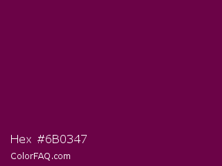 Hex #6b0347 Color is a very dark magenta color and the nearest color is Pompadour #660045. Hex code #6b0347 and RGB value is rgb(107,3,71). In RGB color space, this color is composed of 42% red, 1% green, 28% blue, In CMYK color space, this color is composed of 0% cyan, 97% magenta, 34% yellow , 58% black , In HSL color space, this color has a hue angle of 321° , 95% saturation and 22% lightness.