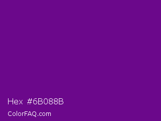Hex #6b088b Color is a dark purple color and the nearest color is Purple #660099. Hex code #6b088b and RGB value is rgb(107,8,139). In RGB color space, this color is composed of 42% red, 3% green, 55% blue, In CMYK color space, this color is composed of 23% cyan, 94% magenta, 0% yellow , 45% black , In HSL color space, this color has a hue angle of 285° , 89% saturation and 29% lightness.