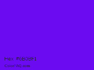 Hex #6b0bf1 Color is a normal violet color and the nearest color is Electric Indigo #6f00ff. Hex code #6b0bf1 and RGB value is rgb(107,11,241). In RGB color space, this color is composed of 42% red, 4% green, 95% blue, In CMYK color space, this color is composed of 56% cyan, 95% magenta, 0% yellow , 5% black , In HSL color space, this color has a hue angle of 265° , 91% saturation and 49% lightness.