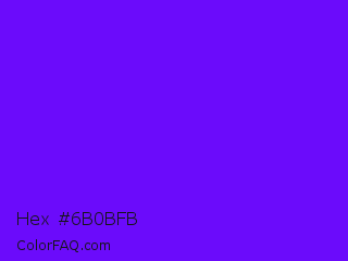 Hex #6b0bfb Color is a normal violet color and the nearest color is Electric Indigo #6f00ff. Hex code #6b0bfb and RGB value is rgb(107,11,251). In RGB color space, this color is composed of 42% red, 4% green, 98% blue, In CMYK color space, this color is composed of 57% cyan, 96% magenta, 0% yellow , 2% black , In HSL color space, this color has a hue angle of 264° , 97% saturation and 51% lightness.