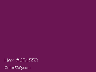 Hex #6b1553 Color is a dark magenta color and the nearest color is Pansy Purple #78184a. Hex code #6b1553 and RGB value is rgb(107,21,83). In RGB color space, this color is composed of 42% red, 8% green, 33% blue, In CMYK color space, this color is composed of 0% cyan, 80% magenta, 22% yellow , 58% black , In HSL color space, this color has a hue angle of 317° , 67% saturation and 25% lightness.