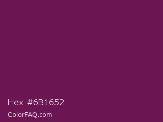 Hex #6b1652 Color is a dark magenta color and the nearest color is Pansy Purple #78184a. Hex code #6b1652 and RGB value is rgb(107,22,82). In RGB color space, this color is composed of 42% red, 9% green, 32% blue, In CMYK color space, this color is composed of 0% cyan, 79% magenta, 23% yellow , 58% black , In HSL color space, this color has a hue angle of 318° , 66% saturation and 25% lightness.