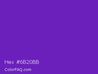 Hex #6b20bb Color is a normal violet color and the nearest color is Purple Heart Crayola #652dc1. Hex code #6b20bb and RGB value is rgb(107,32,187). In RGB color space, this color is composed of 42% red, 13% green, 73% blue, In CMYK color space, this color is composed of 43% cyan, 83% magenta, 0% yellow , 27% black , In HSL color space, this color has a hue angle of 269° , 71% saturation and 43% lightness.