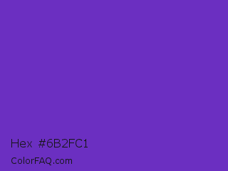 Hex #6b2fc1 Color is a normal violet color and the nearest color is Purple Heart Crayola #652dc1. Hex code #6b2fc1 and RGB value is rgb(107,47,193). In RGB color space, this color is composed of 42% red, 18% green, 76% blue, In CMYK color space, this color is composed of 45% cyan, 76% magenta, 0% yellow , 24% black , In HSL color space, this color has a hue angle of 265° , 61% saturation and 47% lightness.