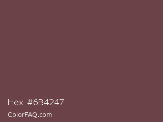 Hex #6b4247 Color is a normal red color and the nearest color is Rose Ebony #674846. Hex code #6b4247 and RGB value is rgb(107,66,71). In RGB color space, this color is composed of 42% red, 26% green, 28% blue, In CMYK color space, this color is composed of 0% cyan, 38% magenta, 34% yellow , 58% black , In HSL color space, this color has a hue angle of 353° , 24% saturation and 34% lightness.