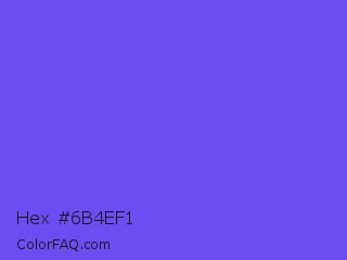 Hex #6b4ef1 Color is a light indigo color and the nearest color is Majorelle Blue #6050dc. Hex code #6b4ef1 and RGB value is rgb(107,78,241). In RGB color space, this color is composed of 42% red, 31% green, 95% blue, In CMYK color space, this color is composed of 56% cyan, 68% magenta, 0% yellow , 5% black , In HSL color space, this color has a hue angle of 251° , 85% saturation and 63% lightness.