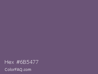 Hex #6b5477 Color is a normal purple color and the nearest color is Smoky #605b73. Hex code #6b5477 and RGB value is rgb(107,84,119). In RGB color space, this color is composed of 42% red, 33% green, 47% blue, In CMYK color space, this color is composed of 10% cyan, 29% magenta, 0% yellow , 53% black , In HSL color space, this color has a hue angle of 279° , 17% saturation and 40% lightness.