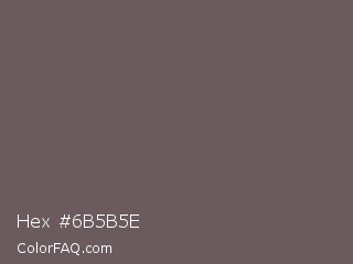 Hex #6b5b5e Color is a normal red color and the nearest color is Scorpion #695f62. Hex code #6b5b5e and RGB value is rgb(107,91,94). In RGB color space, this color is composed of 42% red, 36% green, 37% blue, In CMYK color space, this color is composed of 0% cyan, 15% magenta, 12% yellow , 58% black , In HSL color space, this color has a hue angle of 349° , 8% saturation and 39% lightness.
