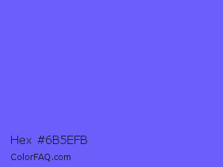 Hex #6b5efb Color is a light indigo color and the nearest color is Very Light Blue #6666ff. Hex code #6b5efb and RGB value is rgb(107,94,251). In RGB color space, this color is composed of 42% red, 37% green, 98% blue, In CMYK color space, this color is composed of 57% cyan, 63% magenta, 0% yellow , 2% black , In HSL color space, this color has a hue angle of 245° , 95% saturation and 68% lightness.