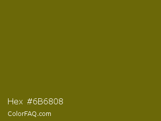 Hex #6b6808 Color is a dark yellow color and the nearest color is Spicy Mustard #74640d. Hex code #6b6808 and RGB value is rgb(107,104,8). In RGB color space, this color is composed of 42% red, 41% green, 3% blue, In CMYK color space, this color is composed of 0% cyan, 3% magenta, 93% yellow , 58% black , In HSL color space, this color has a hue angle of 58° , 86% saturation and 23% lightness.
