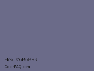 Hex #6b6b89 Color is a normal blue color and the nearest color is Storm Gray #717486. Hex code #6b6b89 and RGB value is rgb(107,107,137). In RGB color space, this color is composed of 42% red, 42% green, 54% blue, In CMYK color space, this color is composed of 22% cyan, 22% magenta, 0% yellow , 46% black , In HSL color space, this color has a hue angle of 240° , 12% saturation and 48% lightness.